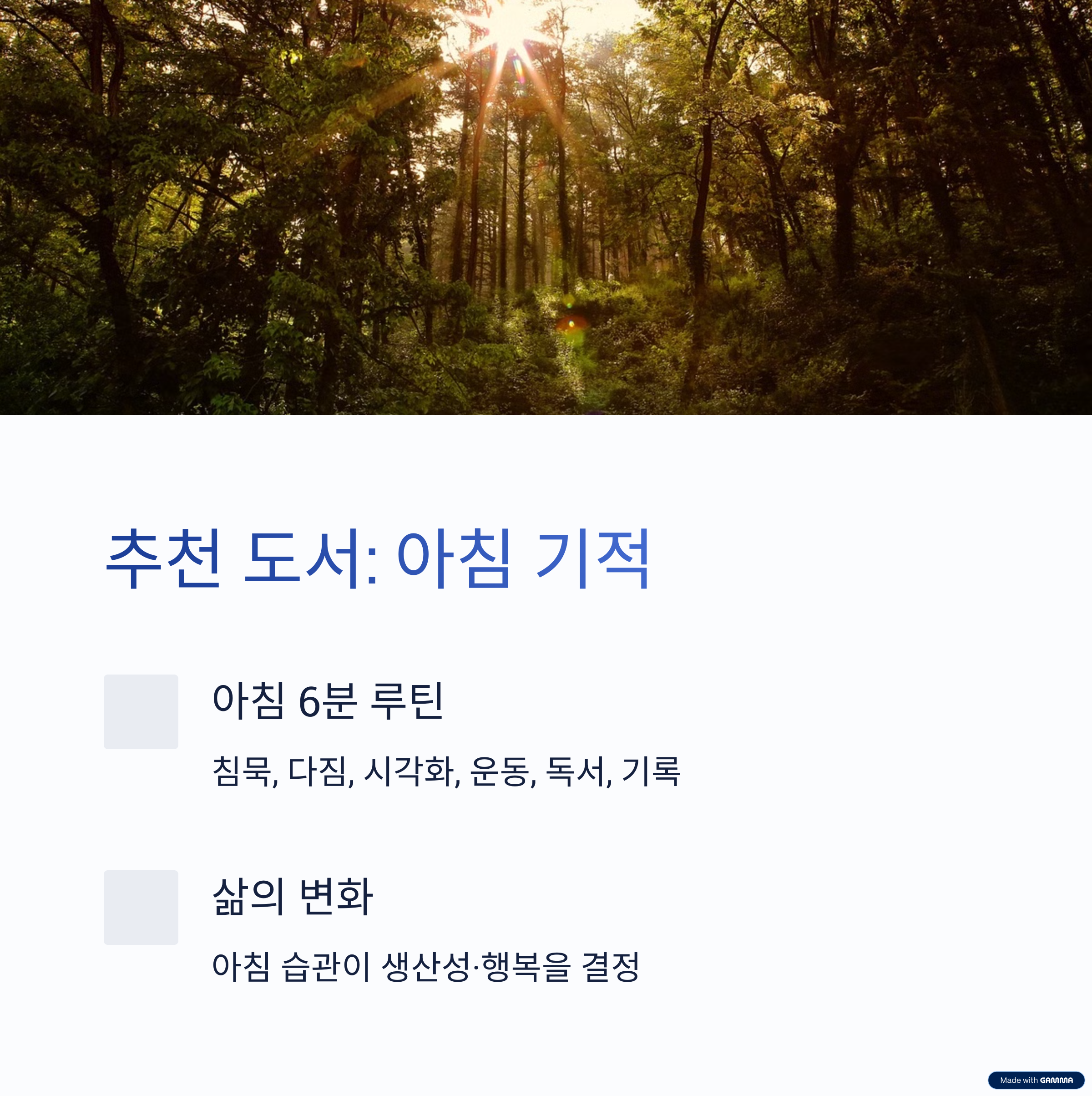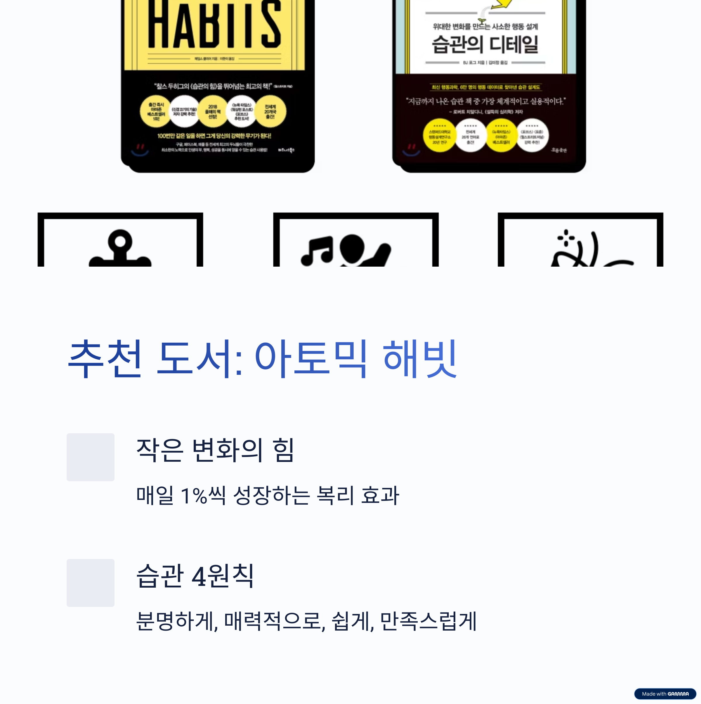 | 목표 설정과 실천이 핵심 | 아토믹 해빗, 아침 기적 추천 | 매일 10분 독서로 시작 |